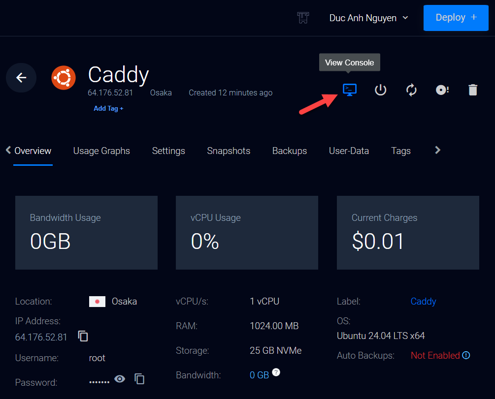 Nhưng trước hết bạn cần biết password cho tài khoản root (tài khoản có quyền cao nhất trên VPS) nằm ở đâu. Bạn click vào tên VPS để biết thông tin này:
