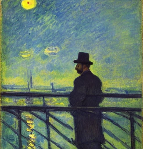 Gợi ý (prompt) được tôi dùng là: “Người đàn ông đứng trên cầu ngắm hoàng hôn”.