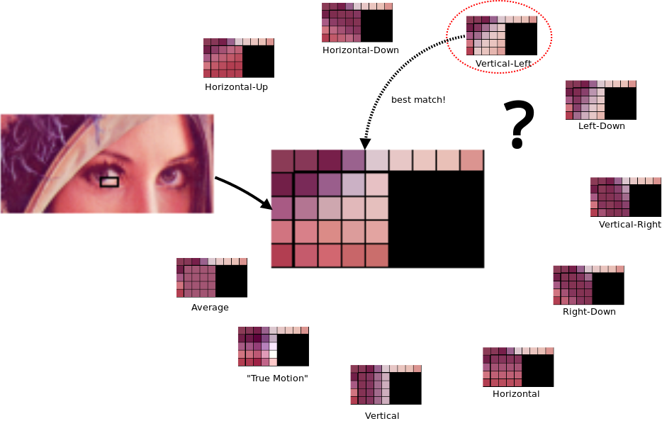 Có 13 mô hình dự đoán khác nhau. Một số cái phổ biến (prevalent ones) là left, top, top-left & top-right pixels. Số còn lại là kết hợp (trung bình) của left, top, top-left và top-right.