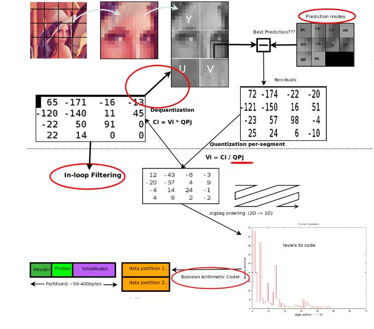 Biểu đồ tiếp theo cho thấy các bước tham gia vào quá trình nén mất dữ liệu của WebP. Các đặc điểm khác khi so sánh với JPEG được khoanh tròn với màu đỏ.