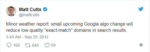 Đại ý rằng tên miền khớp chính xác từ khóa không còn được coi trọng như trước đây trên kết quả tìm kiếm nữa (họ gọi nó là EMD update).