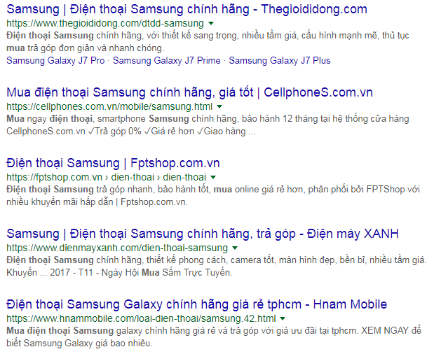 Khi tôi thử tra từ khóa mua điện thoại Samsung, cốt để tìm ra những website bán điện thoại, kết quả: