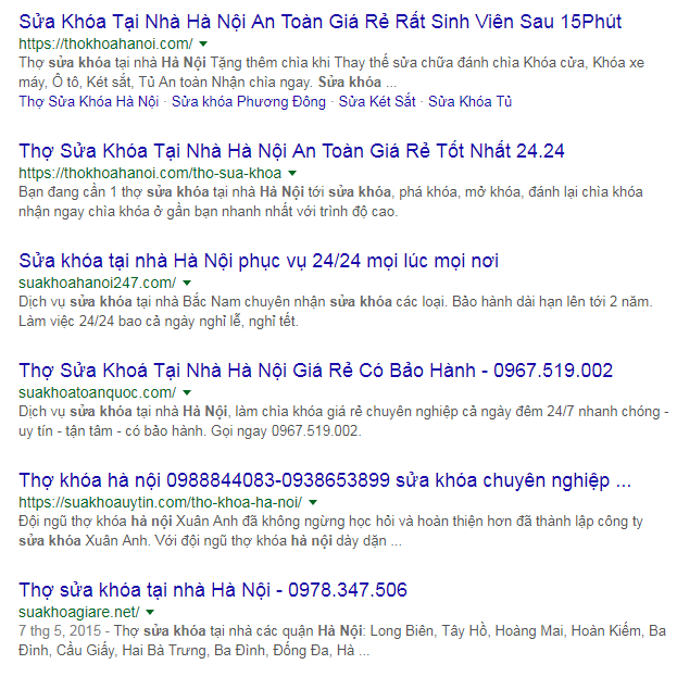 Thí dụ khi tôi tra từ khóa “sửa khóa hà nội” trên Google, tất cả tên miền thuộc top đầu đều là tên miền chung chung, hướng đến việc khớp chính xác một từ khóa cụ thể nào đó: