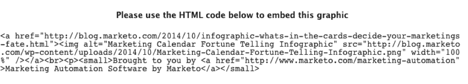 Bao gồm một mã nhúng trong bài Infographic của bạn là cách tuyệt vời để không chỉ khuyến khích chia sẻ dễ dàng, mà còn để đảm bảo rằng bạn có được sự ghi công trong các hình thức liên kết inbound.