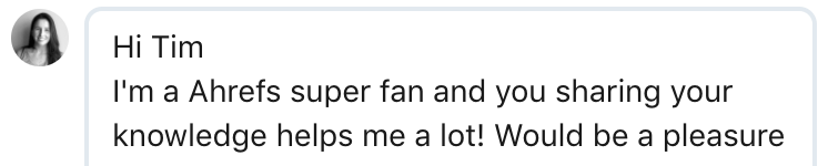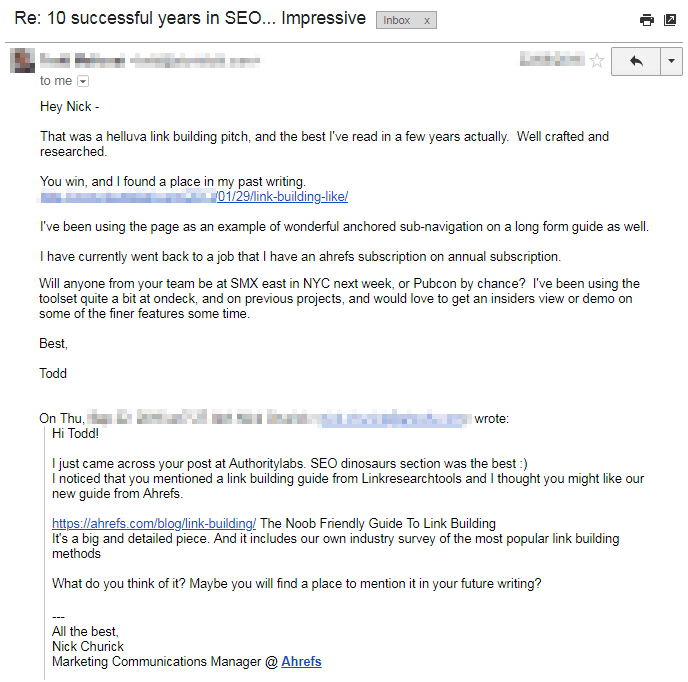 Dưới đây là một ví dụ về tiếp cận email mà chúng tôi gửi (và phản hồi) khi quảng bá cho hướng dẫn xây dựng liên kết của chúng tôi: