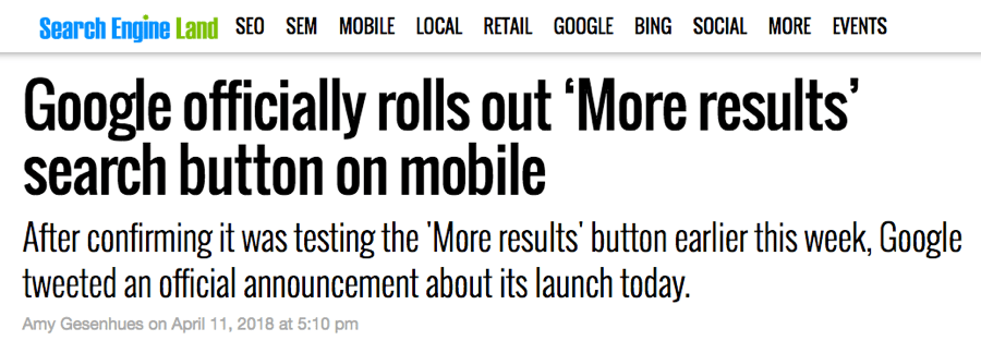 Lấy ví dụ, đây là một bài viết gần đây từ Search Engine Land về việc Google phát hành nút bấm “nhiều kết quả hơn/more results” trên thiết bị di động.