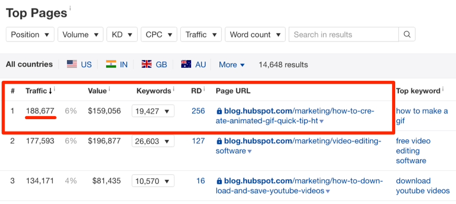Vì thế, cho dù bài viết “cách tạo ảnh GIF” (từ Hubspot) nhận được lưu lượng truy cập tìm kiếm gấp 4 lần lưu lượng của toàn bộ blog chúng tôi có (theo ước tính của Ahrefs), nó không bao giờ là chủ đề mà chúng tôi sẽ xem xét tạo nội dung.
