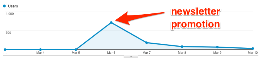 Lấy ví dụ, chúng tôi nhận được đỉnh trong lưu lượng truy cập đẹp như thế này (nice spike in traffic) khi chúng tôi quảng bá bài đăng mới cho những người nhận bản tin qua email.
