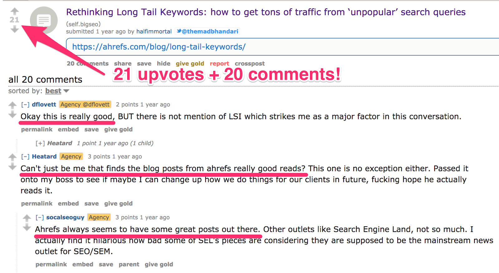 Để đưa ra ví dụ thực tế, dưới đây là một bài đăng trên Reddit mà các thành viên ở đó đã nói nhiều điều tốt đẹp về nội dung của blog Ahrefs – bài viết của chúng tôi về từ khóa đuôi dài.