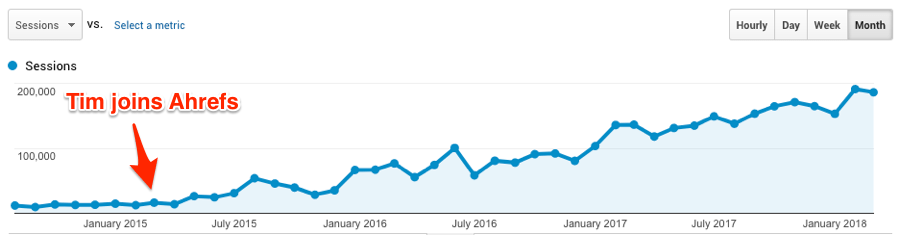 Quay trở lại thời điểm khi tôi gia nhập Ahrefs với vị trí CMO (cách đây gần 3 năm), blog của Ahrefs còn rất ít người biết đến. Nó chỉ có xấp xỉ 15 ngàn lượt xem mỗi tháng, và mặc dù xuất bản 3 bài viết mới mỗi tuần, lưu lượng truy cập không hề tăng lên.