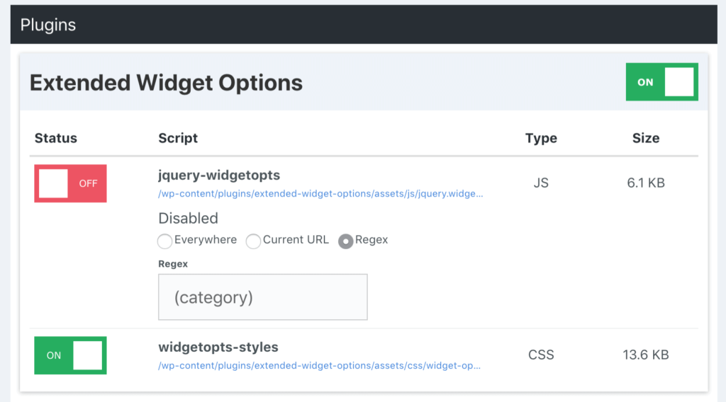 Bạn có thể vô hiệu hóa hoặc bật script trong Script Manager của plugin Perfmatters bằng cách sử dụng Regex (rugular expressions). Điều này đặc biệt hữu ích với các website có cấu trúc URL phức tạp hơn hoặc với các trang được tạo động (archives, tìm kiếm, vân vân).