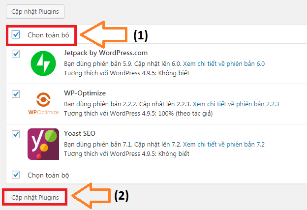 Tiếp đó bạn click vào Chọn toàn bộ, rồi nhấn nút Cập nhật Plugins.