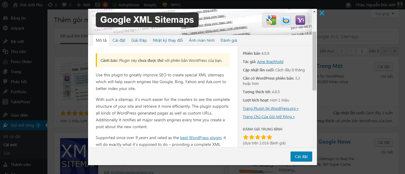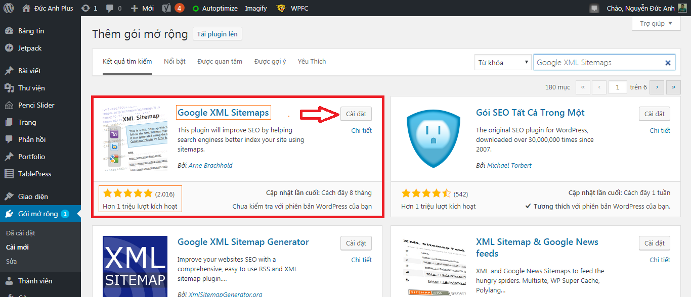 Giả sử mình muốn cài plugin Google XML Sitemaps, mình gõ tên đó vào ô tìm kiếm, kết quả sẽ hiện ra như thế này: