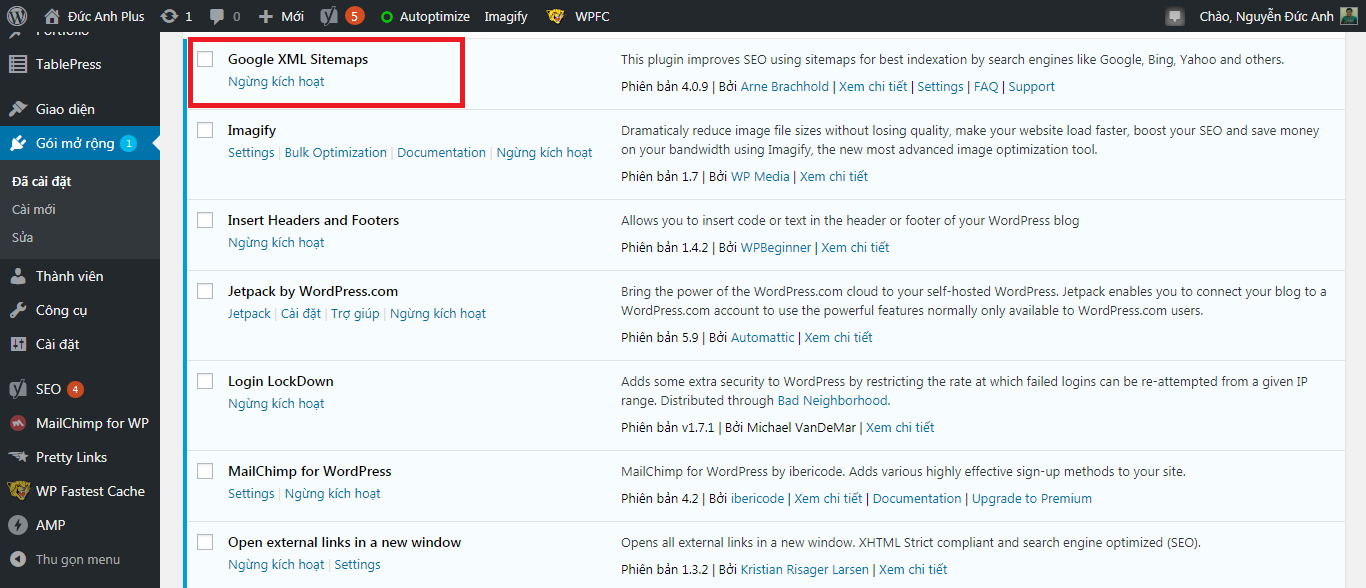 OK, giờ mình mới nhấn nút Cài đặt xem chuyện gì xảy ra tiếp. Nó chuyển sang chữ Kích hoạt, và bạn cần nhất vào nút này nữa là xong, nó sẽ chuyển bạn sang giao diện các plugin đã cài đặt, và bạn sẽ thấy plugin mình vừa mới cài xong ở đây (sắp xếp theo thứ tự ABC):