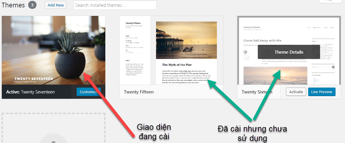Hai giao diện có mũi tên màu xanh chỉ vào là các giao diện đã cài nhưng hiện chưa kích hoạt (giống như rất nhiều bộ quần áo đang cất trong tủ, chưa được mặc), đơn giản là vì một trang web không thể đồng thời sử dụng 2 giao diện cùng một lúc được .