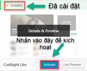 Cài đặt xong thì nghĩa là giao diện đó đã được bạn đưa về website nhưng vẫn chưa thực sự sử dụng (điều này giống như bạn mới mua quần áo cất vào tủ thôi, còn bạn vẫn chưa thực sự mặc bộ đó), để chuyển sang sử dụng giao diện đấy thì bạn cần kích hoạt: