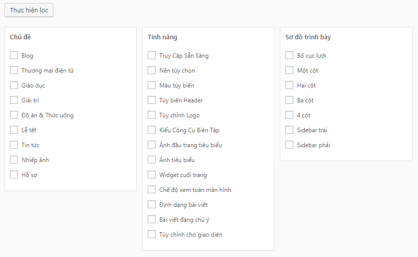 Trong đó Featured là các giao diện nổi bật (là cái mặc định sẽ hiển thị cho bạn chọn), Popular là các giao diện phổ biến và Feature Filter là bộ lọc chi tiết hơn theo hướng dựa vào chức năng: