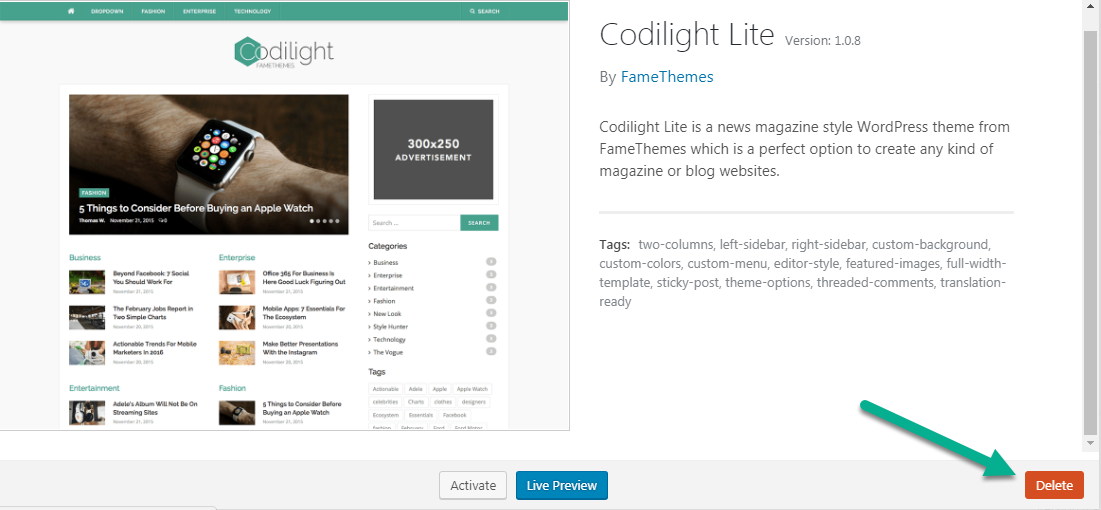 Thao tác xóa theme rất đơn giản. Bạn click vào theme muốn xóa rồi nhấn vào chữ Delete ở góc ngoài cùng bên tay phải: