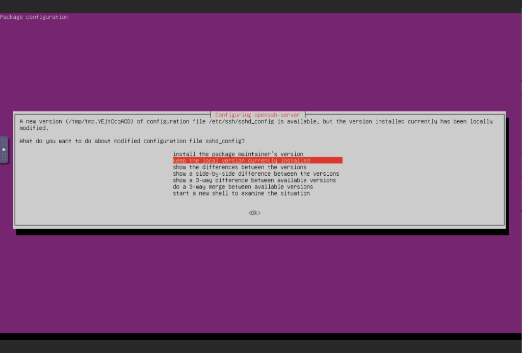 Giữ nguyên tùy chọn ‘keep the local version currently installed‘ (trong hình trên nghĩa là chúng ta giữ nguyên các tùy chọn liên quan đến SSH, thường sẽ an toàn hơn khi giữ nguyên) và bấm Enter.