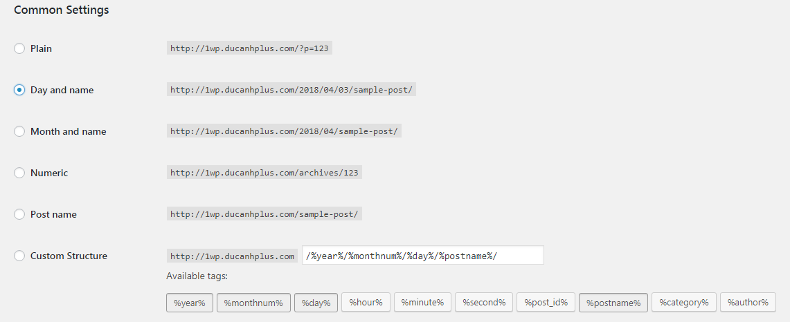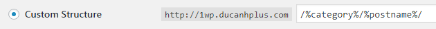 Bạn chỉ cần quan tâm đến cái cuối cùng chỗ Custom Structure, vì đây là chỗ mà chúng ta tùy chỉnh cấu trúc URL theo ý của mình.