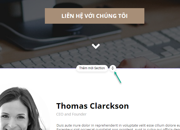Để thêm khối mới vào landing page trong LadiPage, bạn cũng click vào đường biên giữa 2 khối muốn chèn, sau đó click biểu tượng “Thêm mới Section“.