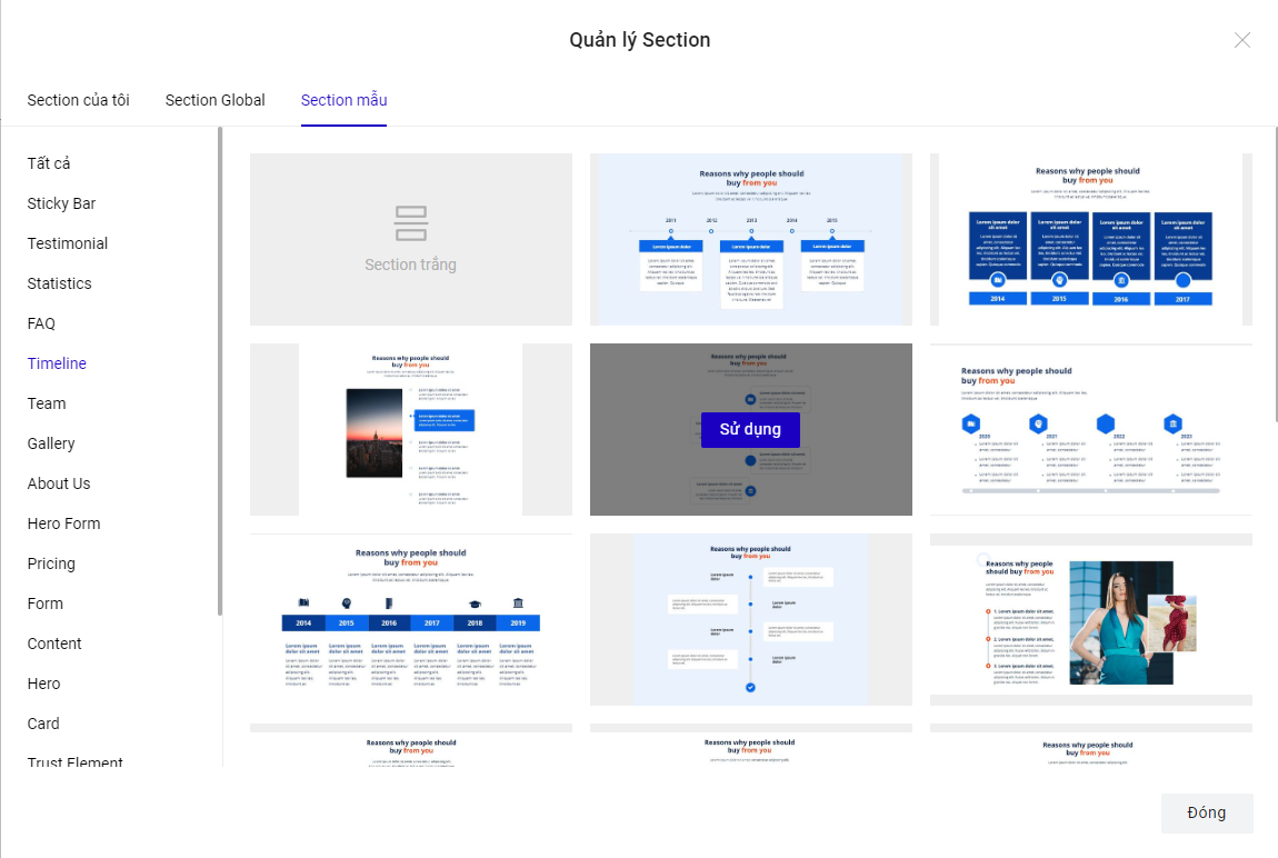 Sau đó bạn sẽ thấy các section mẫu: