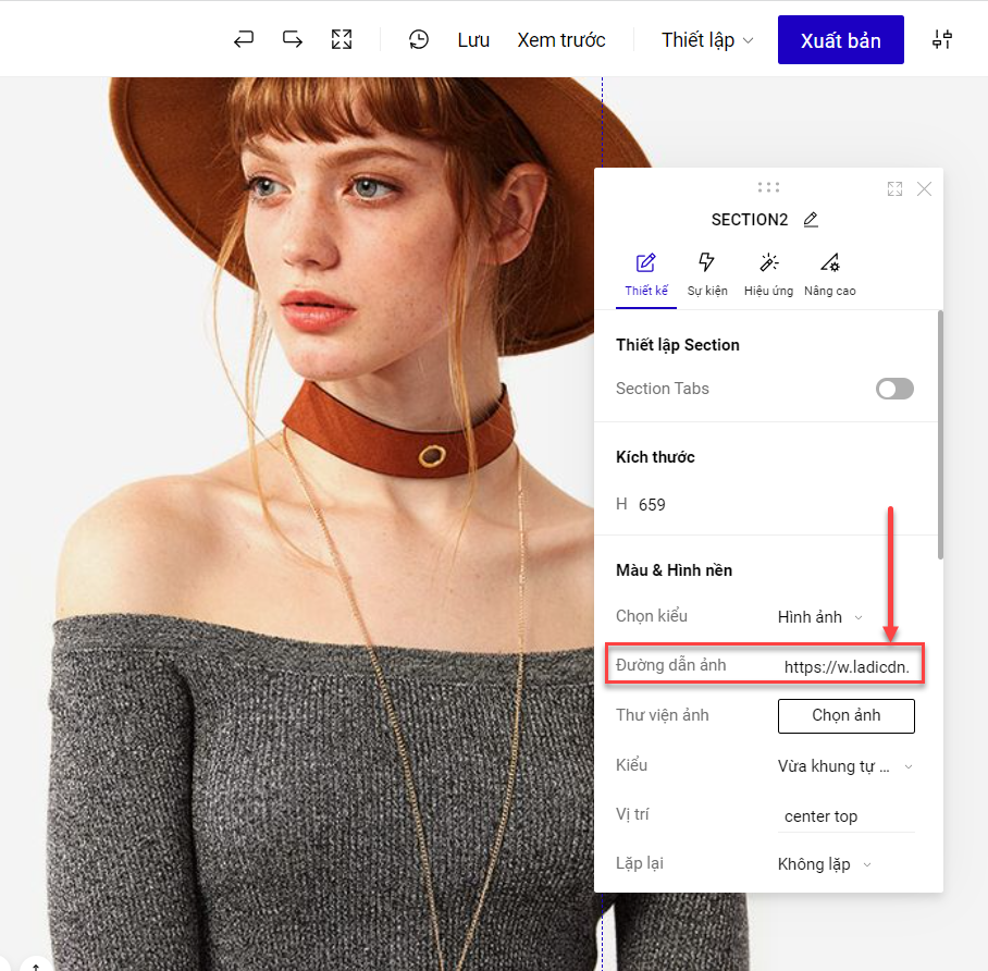 Rồi bạn đưa URL này vào phần đường dẫn ảnh trên LadiPage.