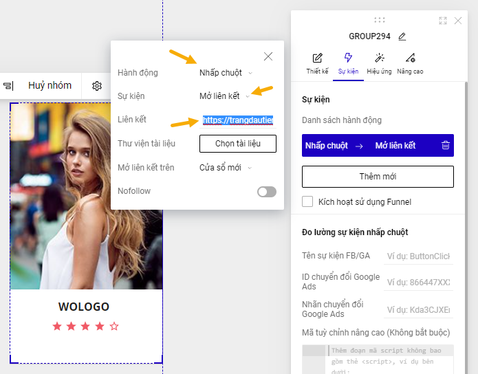 Một Popup nhỏ hiện ra, bạn làm như sau, chọn “Hành động” là “Nhấp chuột”, còn “Sự kiện” là “Mở liên kết”, ở phần “Liên kết” thì bạn paste link sản phẩm vào: