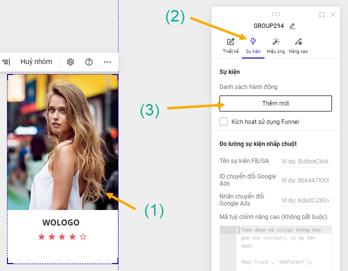Đầu tiên bạn click vào ảnh hoặc text muốn thêm liên kết. Rồi click tiếp vào “Sự kiện”, sau đó là “Thêm mới”.