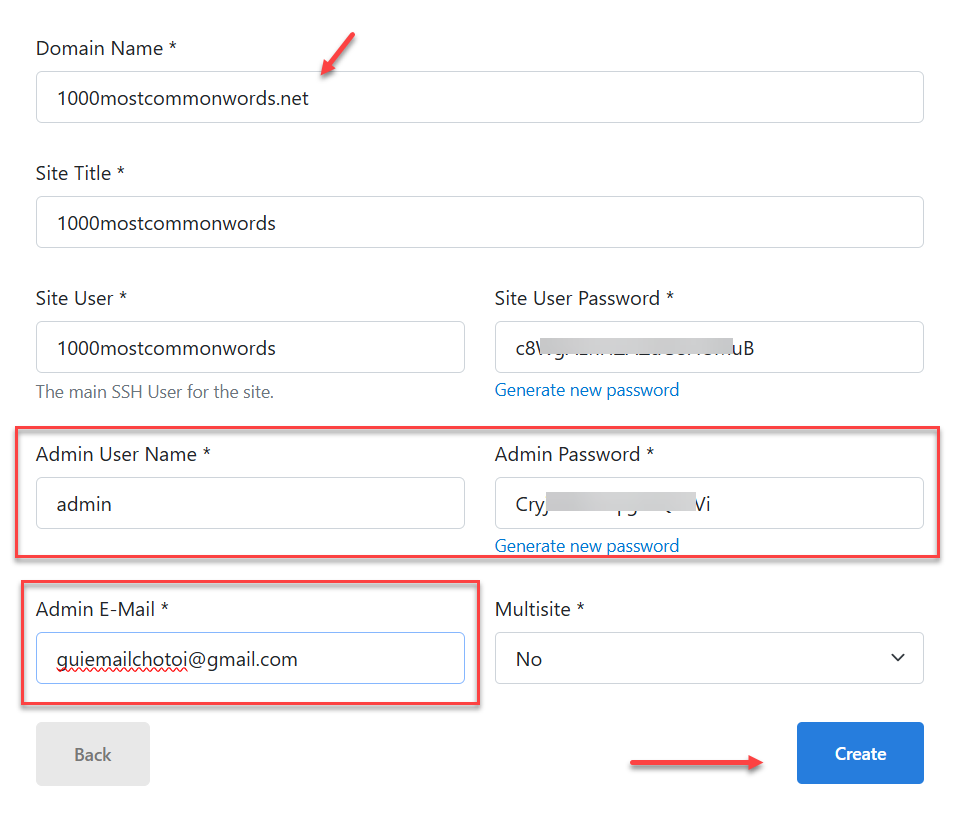 - Chú ý các thông tin Admin User Name (mặc định là admin), và Admin Passwords (được tạo tự động). Nên chủ động thay đổi Admin Passwords thành dạng dễ nhớ hơn, vì đây chính là thông tin để login vào trang WordPress.