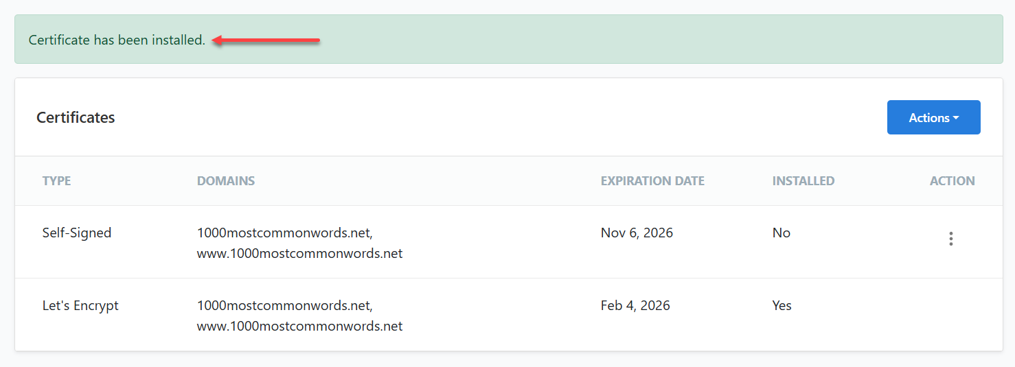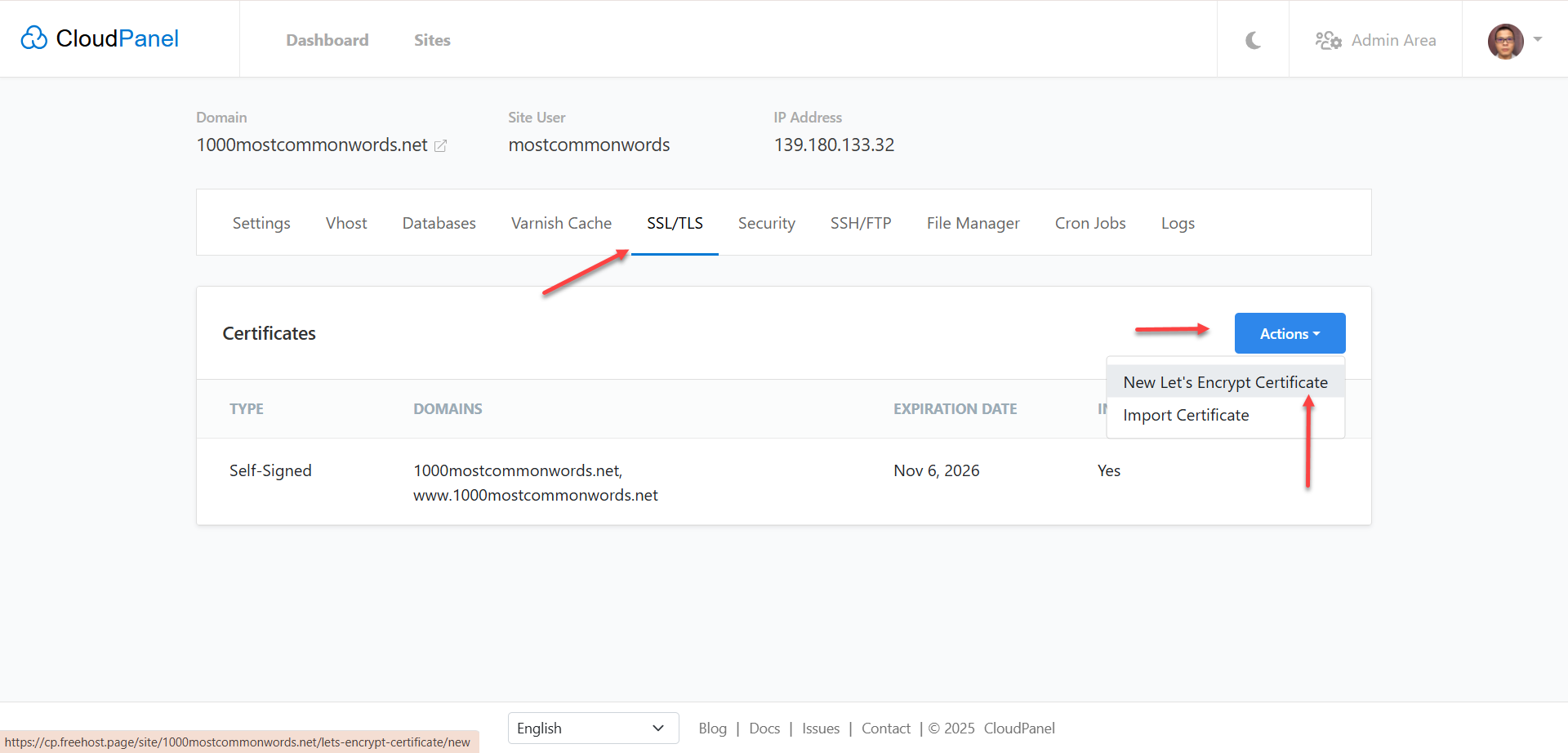 Đấy là do SSL chưa được tạo, bạn cần click vào tên miền đó trong panel quản trị, vào phần SSL để thao tác: Click Actions > New Let’s Encrypt Certificate: