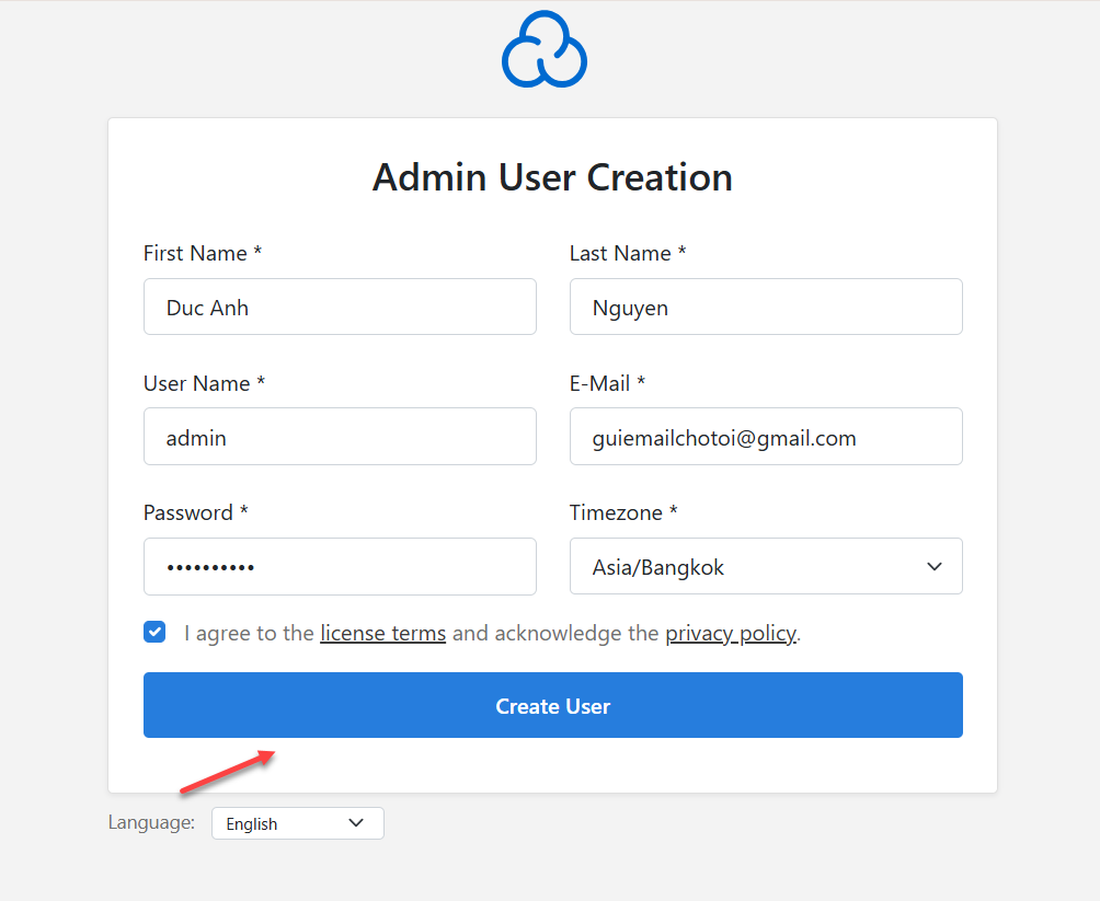 Sau đó nhập thông tin tài khoản admin (tùy theo của bạn, bên dưới là của tôi):
