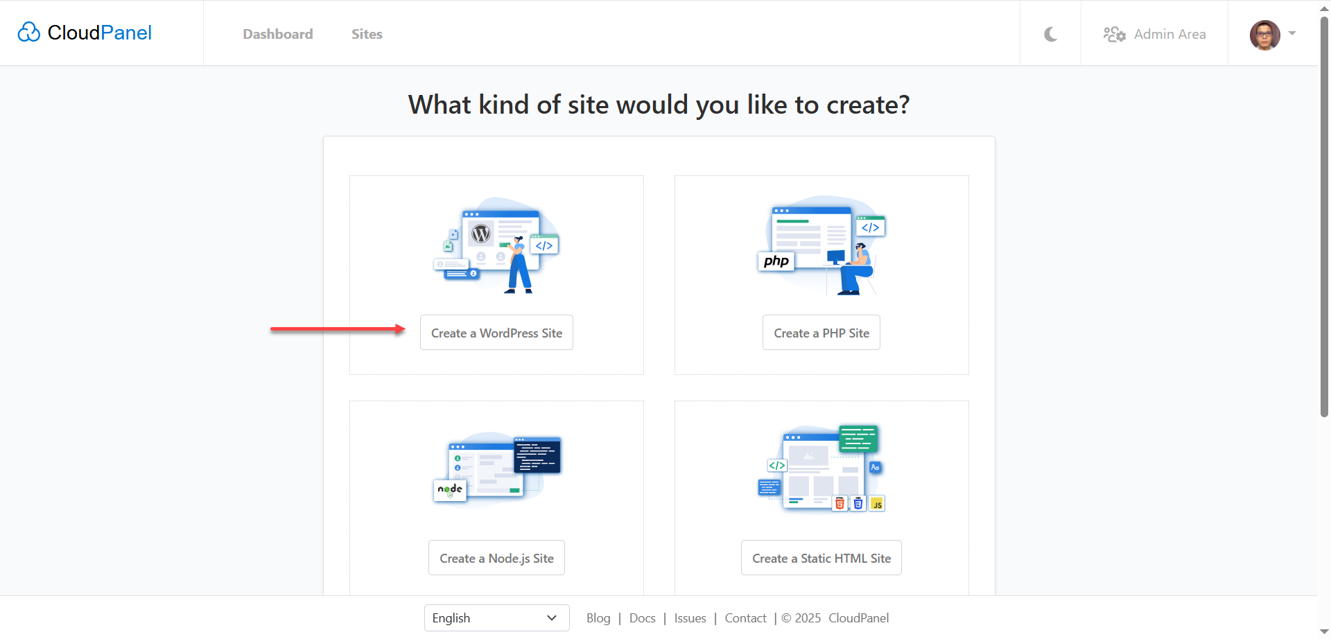 Bạn Add Site > Create a WordPress Site > Điền vào các trường thông tin như yêu cầu là bạn sẽ có trang WordPress tương ứng với tên miền.