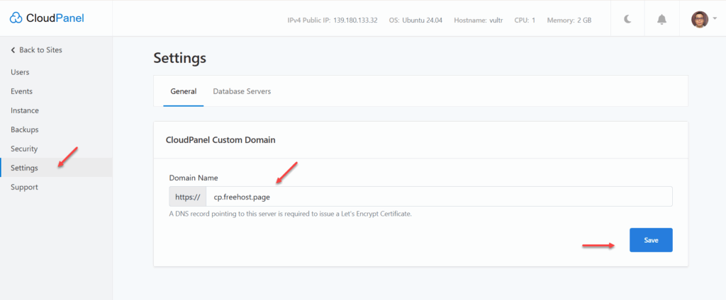 Vào Admin Area (phía trên tay phải) > Settings > Nhập địa chỉ cho control panel.