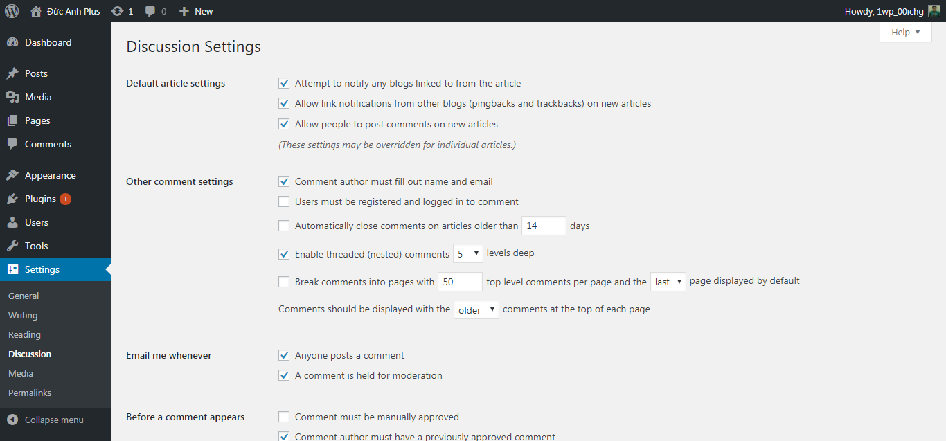 Ở Dashboard (bảng tin), các tùy chỉnh liên quan đến bình luận trên WordPress bạn tìm ở phần Cài đặt > Thảo luận (với giao diện tiếng Anh là Settings > Discussion):