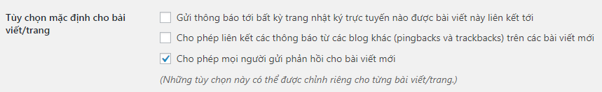 1. Tùy chọn mặc định cho bài viết / trang. Tắt comment trên WordPress nếu muốn
