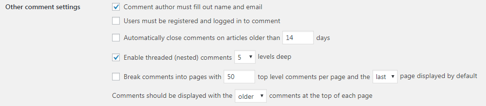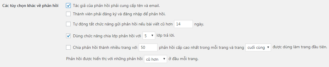 Chia phản hồi thành nhiều trang với phản hồi cấp cao nhất trong mỗi trang và trang được dùng làm trang đầu tiên. Phản hồi được hiển thị với những phản hồi ở đầu mỗi trang: bình thường cái này bỏ chọn, tính năng này bạn chỉ dùng khi bài viết có rất nhiều bình luận. Rắc rối với bài viết có hàng trăm bình luận là độ dài của nó sẽ rất khủng khiếp, chắc chắn nó ảnh hưởng đến tính tiện dụng và tốc độ tải trang. Giải pháp cung cấp ở đây là chia bình luận thành nhiều trang, chẳng hạn như ở trên có ý là cứ 50 bình luận thì lại được chia thành một trang, trang có bình luận mới nhất sẽ làm trang hiển thị đầu tiên, và trong mỗi trang đó, phản hồi cũ hơn sẽ lên trước. Nếu bạn dùng tính năng này hãy thoải mái thay đổi tùy chọn sao cho ưng ý thì thôi, thí dụ thay vì 50 bạn có thể chuyển thành 20 thôi, thay vì để cũ hơn bạn có thể chuyển thành mới hơn.