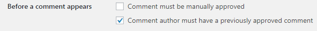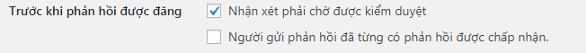 Người gửi phản hồi đã từng có phản hồi được chấp nhận: ý là nếu ai đó bình luận mà trước đây bình luận của họ đã được duyệt rồi thì bình luận này của họ sẽ được tự động đăng mà không phải chờ phê duyệt nữa, tính năng này cũng hay, nhưng để đảm bảo chống spam, bạn nên bỏ tick tùy chọn này. Lựa chọn cá nhân: bỏ chọn.