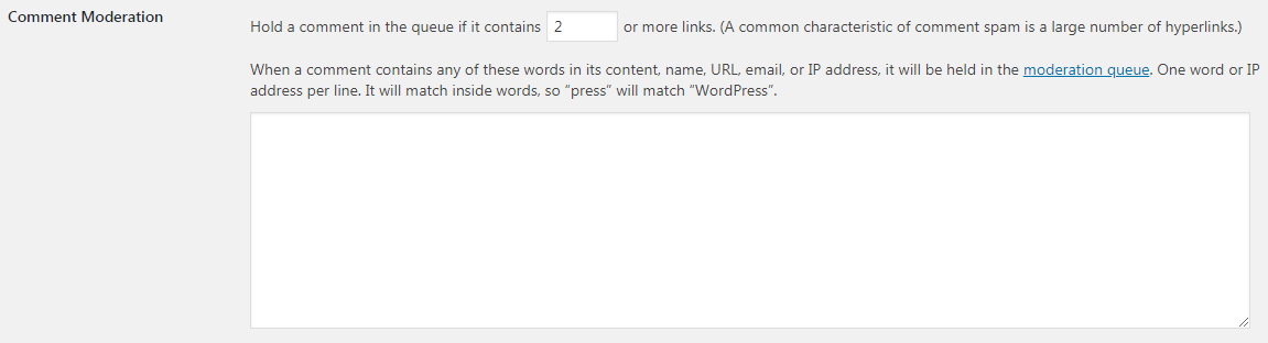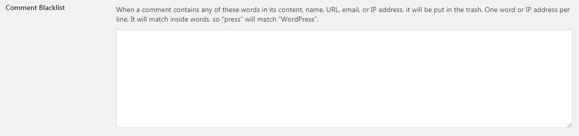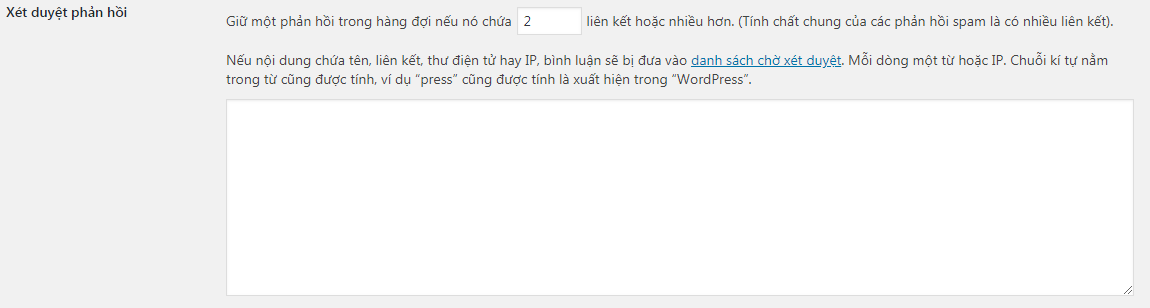 Nếu nội dung chứa tên, liên kết, thư điện tử hay IP, bình luận sẽ bị đưa vào danh sách chờ xét duyệt. Mỗi dòng một từ hoặc IP. Chuỗi kí tự nằm trong từ cũng được tính, ví dụ “press” cũng được tính là xuất hiện trong “WordPress”: điều này có nghĩa là nếu bình luận chứa một từ nào đó bạn sẽ không đăng nó ngay mà sẽ phải chờ xét duyệt, cũng vậy đối với IP nào đấy từng có lịch sử spam hoặc quá khích bạn cũng không muốn comment của họ xuất hiện ngay.