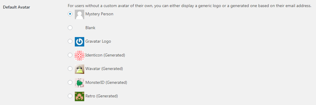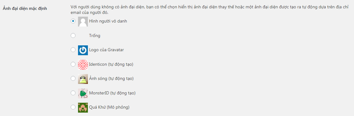 Phần này dùng trong trường hợp người gửi bình luận chưa đăng ký trên gravatar nên họ sẽ không có ảnh đại diện của riêng mình, khi ấy tùy theo ý thích bạn có thể chọn ảnh đại diện cho họ. Hình người vô danh như mặc định là lựa chọn khá hợp lý. Nếu bạn muốn phần comment trông đẹp mắt hơn bạn có thể chọn hình khác.