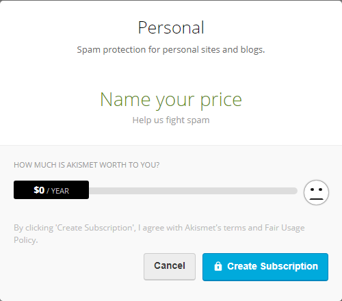 Một cửa sổ lại bật ra gợi ý bạn trả 48$ cho dịch vụ chống spam, tất nhiên vì miễn phí cũng hoạt động tốt nên bạn kéo thanh trượt về 0 USD cho tiết kiệm, rồi nhấn Create Subscription:
