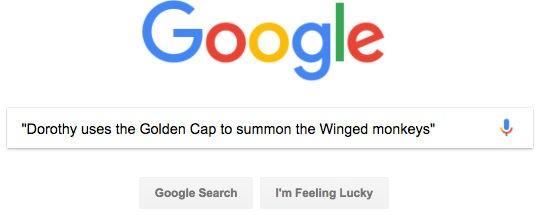 | Một cụm từ trên trang: Dorothy sử dụng Mũ vàng để triệu hồi Khỉ có cánh | Hãy thử truy vấn có cả dấu nháy kép và không có dấu nháy kép xung quanh câu: [“Dorothy sử dụng Mũ vàng để triệu hồi Khỉ có cánh”] [ Dorothy sử dụng Mũ Vàng để triệu hồi Khỉ có cánh] |