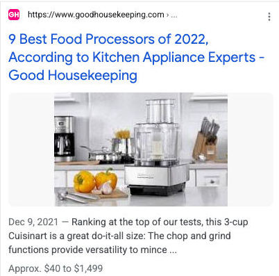 | Truy vấn: [đánh giá máy chế biến thực phẩm cuisinart] Ý định của người dùng: Đây là truy vấn Kiến thức. Người dùng muốn tìm những đánh giá gần đây về máy chế biến thực phẩm Cuisinart. Kết quả: Đây là Khối kết quả tìm kiếm trên web có liên kết đến trang đích có các đánh giá về sản phẩm Cuisinart. | ![]() |