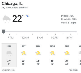 | Truy vấn: [thời tiết] Vị trí người dùng: Chicago, Illinois Ý định của người dùng: Đây là truy vấn Kiến thức Đơn giản vì người dùng có nhu cầu thông tin khá đơn giản: tìm nhiệt độ hiện tại và khả năng có mưa hoặc tuyết. Người dùng muốn biết thời tiết ở Vị trí của Người dùng (User Location). Lưu ý: Giả sử khối hiển thị thông tin hiện tại của người dùng. /Size..Size..Size..Size..Size..Size/ | ![]() /Size..Size..Size..Size..Size..Size/ |