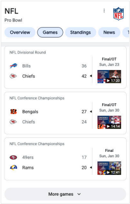 | Truy vấn: [điểm NFL] Ý định của người dùng: Đây là truy vấn Kiến thức. Người dùng muốn tìm tỷ số gần đây nhất của Giải National Football League. | ![]() |