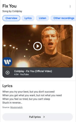 | Truy vấn: [coldplay fix you video] Ý định của người dùng: Đây là truy vấn Thực hiện. Người dùng muốn xem MV của bài hát “Fix You” của Coldplay. Kết quả: Bằng cách nhấp vào khối kết quả này, người dùng có thể phát video nhạc của bài hát, tìm hiểu thêm về nghệ sĩ/album, v.v. /Size..Size..Size..Size..Size..Size/ | ![]() /Size..Size..Size..Size..Size..Size/ |