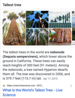 | Câu hỏi: [cây nào cao nhất] Ý định của người dùng: Đây là một truy vấn dạng Kiến thức Đơn giản. Người dùng muốn biết loại cây nào cao nhất. /Size..Size..Size..Size..Size..Size/ | ![]() /Size..Size..Size..Size..Size..Size/ |