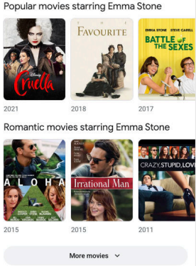 | Truy vấn: [phim emma stone] Ý định của người dùng: Đây là truy vấn Kiến thức. Người dùng muốn nhận thông tin về phim có Emma Stone đóng. Kết quả: Trong khối kết quả này, người dùng có thể xem ngay một số bộ phim nổi tiếng có sự tham gia của Emma Stone, với tùy chọn nhấp vào liên kết để tìm hiểu thêm về từng bộ phim. Người dùng cũng có thể vuốt để xem danh sách phim khác. | ![]() |