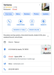 Ở hầu hết các vị trí người dùng khác, không có nhà hàng (hoặc bất kỳ nhà hàng nào khác) có tên Verbena thì chỉ có một cách giải thích cho truy vấn [verbena]: loài thực vật. Nhà hàng Austin không nổi tiếng ngoài Austin, TX.