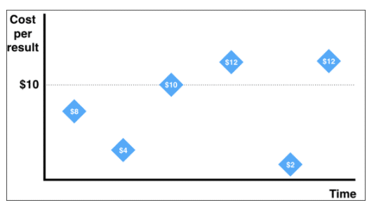 Với pacing, Facebook sẽ cho bạn chuyển đổi có giá thấp hơn nhiều so với giá thầu trung bình nhưng cũng có một số chuyển đổi có giá cao. Như là kết quả, bạn sẽ nhận được nhiều chuyển đổi hơn với giá thầu trung bình bạn muốn. Trong ví dụ bên dưới, hãy tưởng tượng bạn có ngân sách 50$ và thiết lập giá thầu trung bình là 10$. Trong kịch bản này, bạn chi 48$ ngân sách cho 6 kết quả với số tiền trung bình chi thực tế là 8$. Khi nào bạn sử dụng chiến lược đấu giá tối đa: Nếu mục tiêu của bạn là tối đa hoá lợi nhuận và có được khách hàng tiềm năng với giá thấp, hãy để chiến lược giá thầu tối đa (maximum bid).